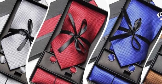 Skvelý darček pre pánov Farebná kravata, vreckovka a manžetové gombíky