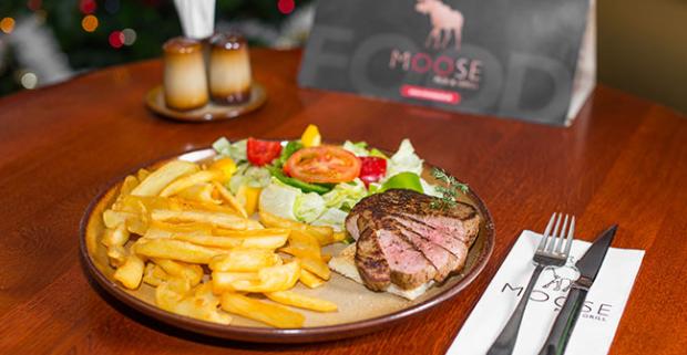 Austrálsky grilovaný Rib eye steak v Moose Pub & Grill. Otvorený dizajn vzducholode, americká a slovenská kuchyňa.