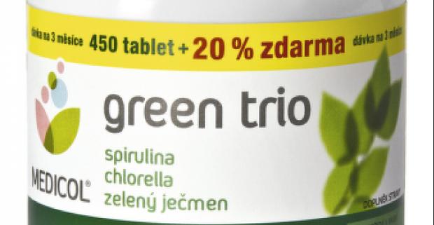 Výživový doplnok Green trio v tabletách, spirulina, chlorela, zelený jačmeň, ktoré sú zdrojom prírodných vitamínov a antioxidantov.
