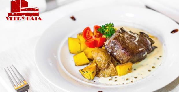 Vychutnajte si skvelé gurmánske pochúťky. Hovädzí steak s omáčkou zo zeleného korenia alebo s grilovanou zeleninou u Veľkého Batu.