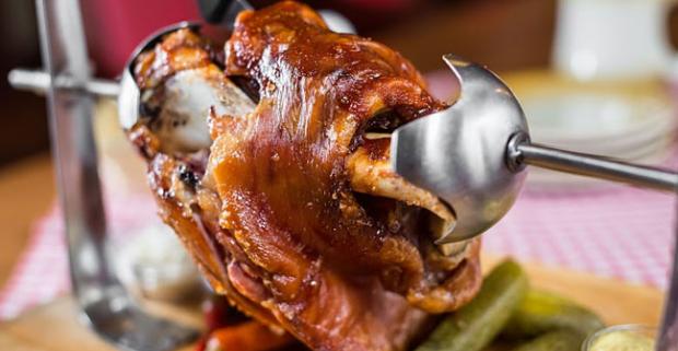 1100 g Bravčové pečené koleno s oblohou v Budweiser Budvar pub alebo v Plzeňskom prazdroji. Zahryznite sa do nefalšovaného kusu mäsa.