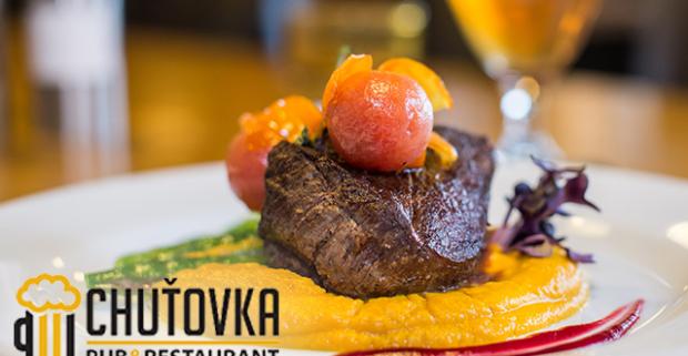 Grilovaný štvrťkilový steak z pravej hovädzej sviečkovej a výborné pivo Karpat. Štýlová a moderne zariadená reštaurácia Chuťovka.