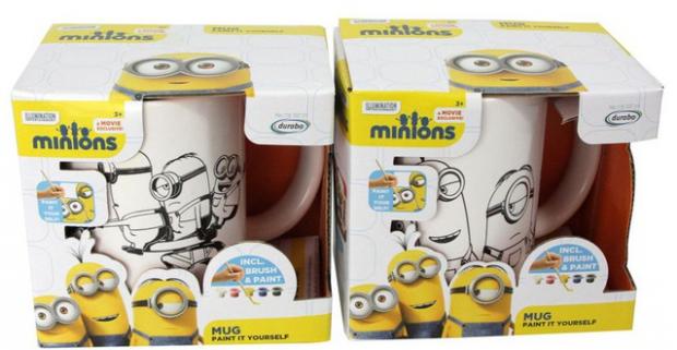 3-dielna súprava obľúbených Mimoňov v podobe keramického hrnčeka, tanierika a plastového pohára, ktoré si vaši drobci môžu vyfarbiť fixkami.