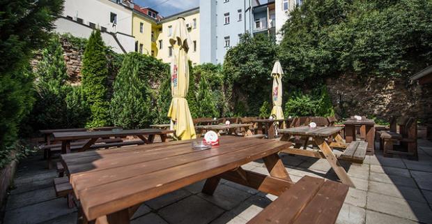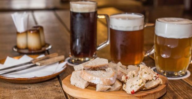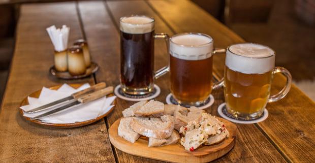 Tri veľké pivá Pressburg varené Staroslovienskym pivovarom, podávanými so škvarkovou nátierkou s domácim chlebom v centre mesta.