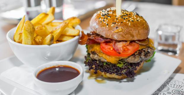 Hovädzí burger v domácej žemli so steakovými hranolkami v bistre…