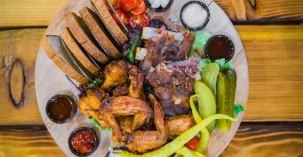 Voňavé marinované rebrá, chrumkavé BBQ krídla, k tomu baranie rohy, uhorky, feferóny a chlieb. Misa špecialít v pivárni Bayerova Sladovňa.
