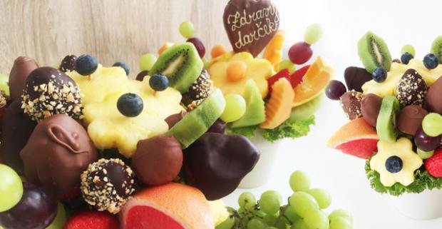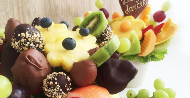 Zdravé ovocné kytice alebo ovocná bonboniéra. Fantastický darček, v ktorom sa pohrávajú kombinácie chutí ovocia, čokolády a orieškov.