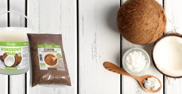 Zdravý kokosový olej na varenie alebo nebielený a nerafinovaný cukor z kvetou a plodov exotických a majestátných paliem.
