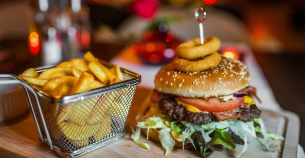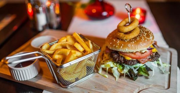 Poriadny náklad - XXL hamburgeru s chrumkavou slaninkou a steakovými hranolčekmi, ktorý na vás netrpezlivo čaká v reštaurácii Red Café 2.