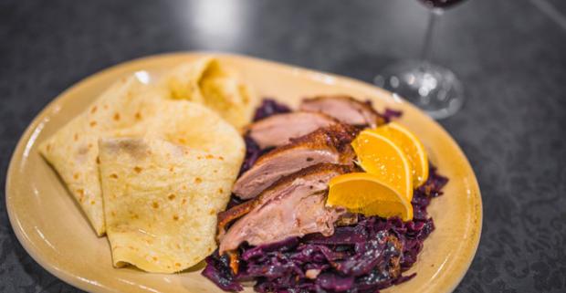 Chrumkavé kačacie stehno Tiež prsia s kapustou, lokšami a pohárom…