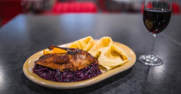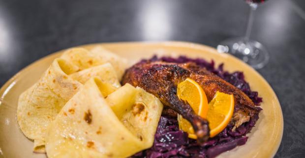 Chrumkavé kačacie stehno Tiež prsia s kapustou, lokšami a pohárom vína