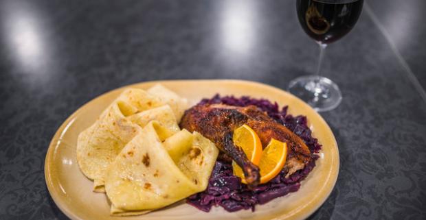 Chrumkavé pokušenie - kačacie stehno či prsia s kapustou, lokšami a k tomu pohár dobrého vína v Penzión a reštaurácia Uhorský Dvor***.