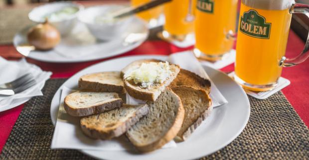 Krígeľ poctivého piva a chrumkavé hrianky - natreté poriadnou vrstvou nivovej nátierky či domáceho šmaľca v 1. košickom minipivovare Golem.