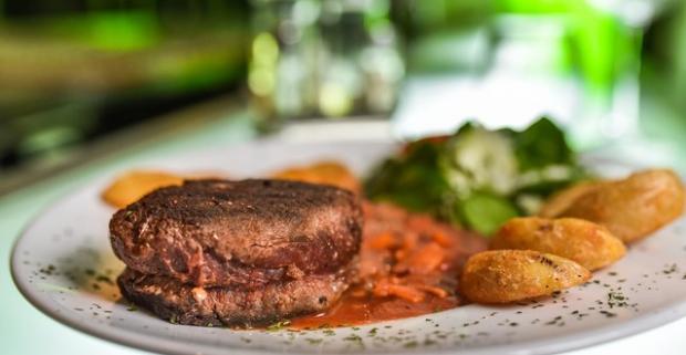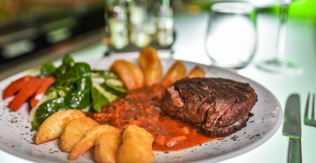 Kvalitný, lahodný, šťavnatý steak z pravej sviečkovice s prílohou a omáčkou podľa výberu v reštaurácii hotela Gaudio.