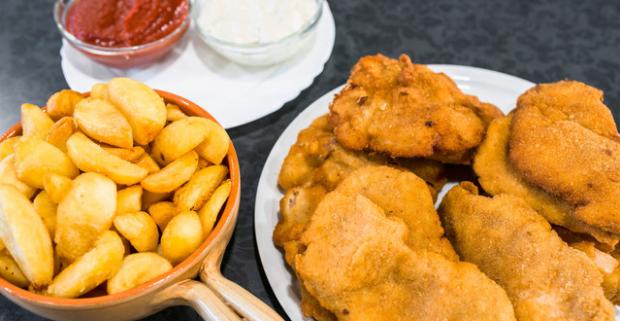 Poriadna nádielka rezňov s americkými zemiakmi, hranolkami, kečupom a tatárskou…