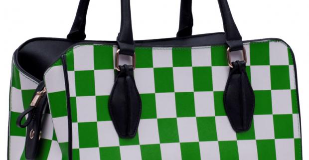 Štýlová dámska kabelka v netradične zelenej farbe s bielou kombináciou v tvare šachovnice.