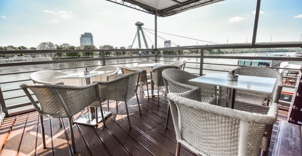 Hamburger a malá Plzeň alebo Kofola v reštaurácii Botela Gracia na Rázusovom nábreží v Bratislave.