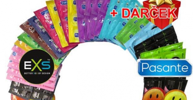 Balíčky špičkových kondómov popredných značiek Durex, EXS, Pasante a Vitalis.