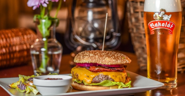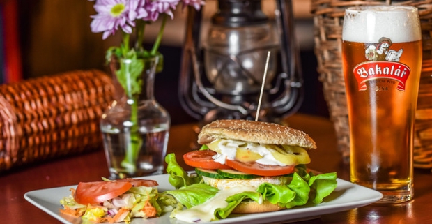 Srbský burger Vojvodina alebo Belgrado s hranolkami a pivom alebo Kofolou.