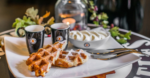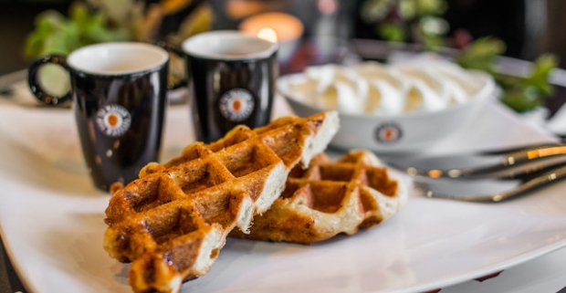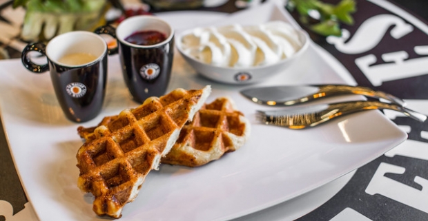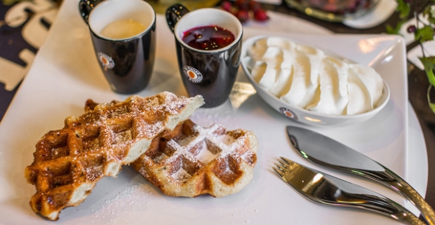 Pravá belgická Wafla s horúcimi višňami, vanilkovým krémom, pravou šľahačkou a espressom.
