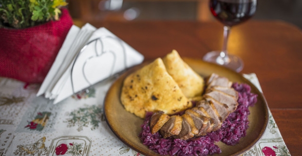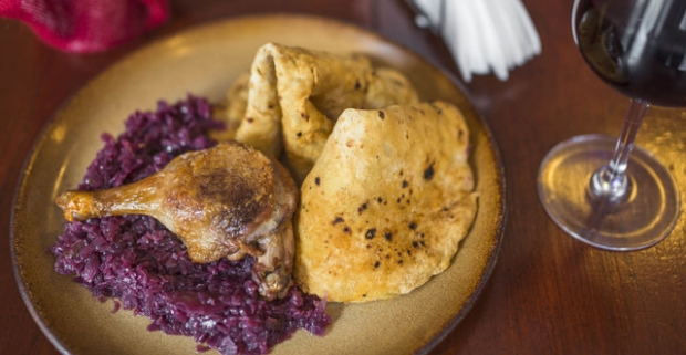 Chrumkavé pečené kačacie stehno alebo prsia s kapustou, lokšami a pohárom vína.