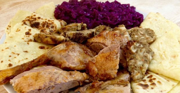Chrumkavá domáca kačka s lokšami, kapustou a kačacou masťou v retro balení, pre 2 - 6 osôb so sebou.