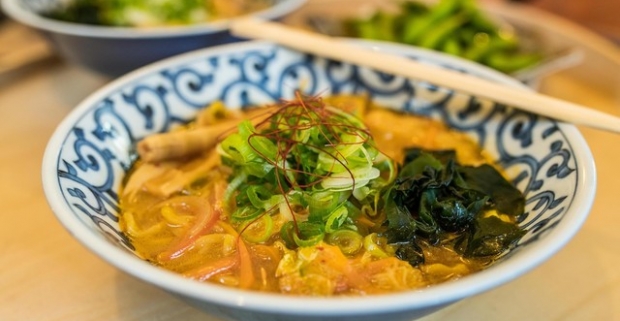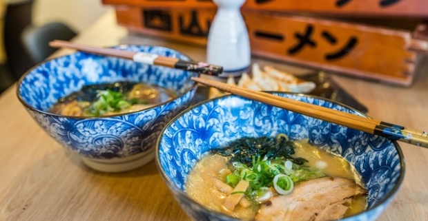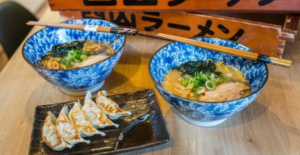 Autentický japonský ramen v reštaurácii Ramen Kazu + Gyoza alebo opražené sójové bôby.