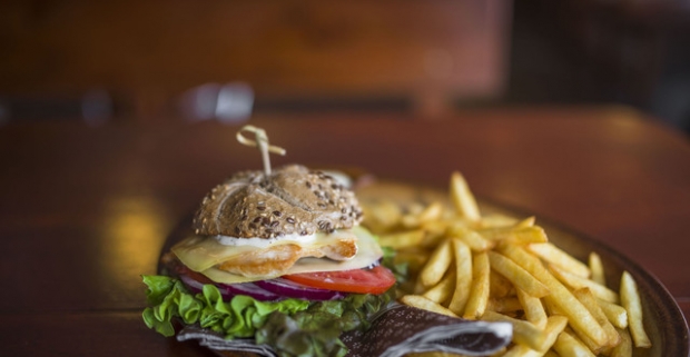 Hamburger s kuracím mäsom alebo hovädzím mäsom v Hostinci u Smädného škorca.