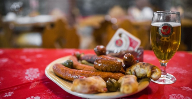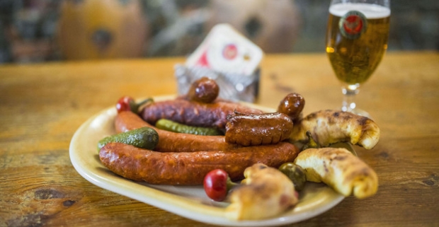 Tanier pečenej klobásy a malé 10 ° pivo v pivárni Metropol. Bez rezervácie, stačí prísť.
