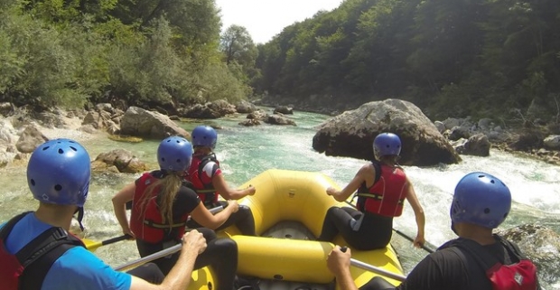 Víkendový rafting na Soči v Slovinsku s výstrojom a skúseným inštruktorom.