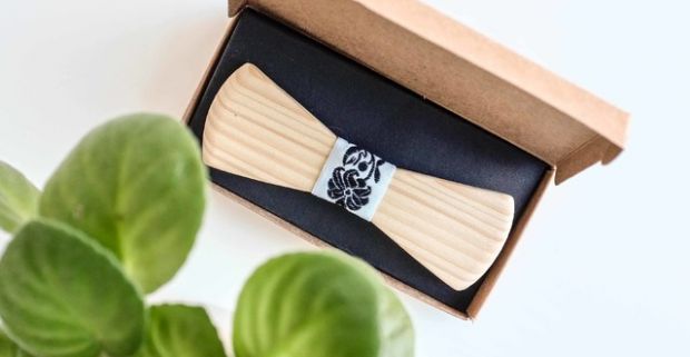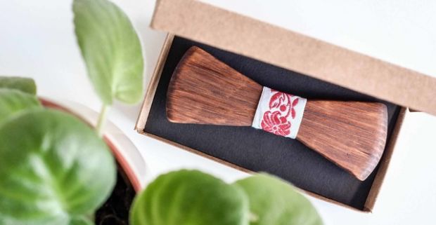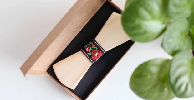 Ručne vyrobený drevený motýlik v krabičke s jedinečným folklórnym motívom.