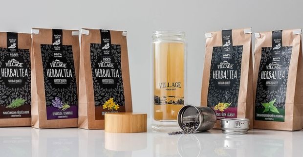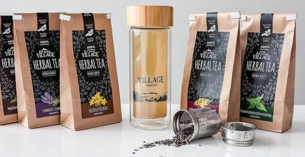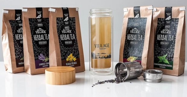 Štýlová termofľaša VILLAGE Bottle + 5 druhov sypaných bylinkových čajov VILLAGE Herbal Tea.