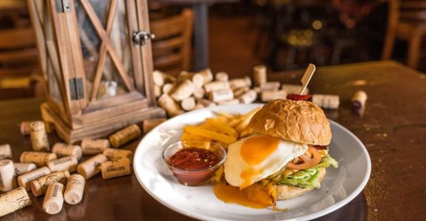 Chrumkavý hovädzí burger s volským okom, slaninou a hranolkami v Českej pivnici.