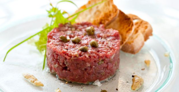 Poctivý tatársky biftek v reštaurácii Bernardov Dvor. Tradičná pochúťka z kvalitného hovädzieho mäsa.
