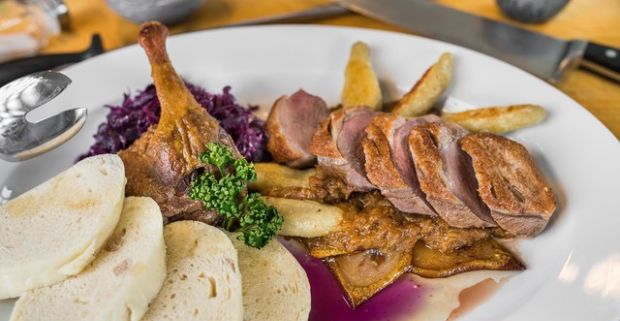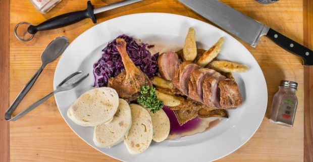 Chrumkavé kačacie špeciality pre dve osoby v reštaurácii Sedmička v Bratislave.