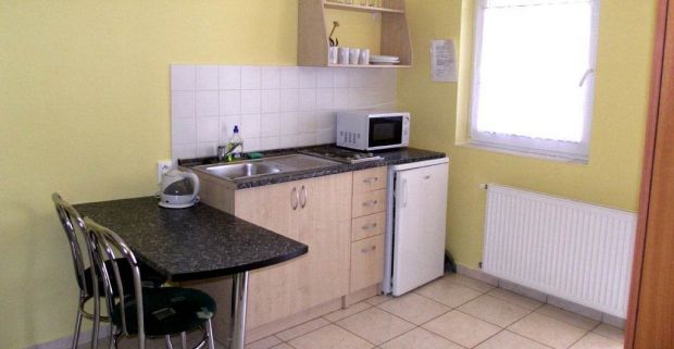 Podhájska neďaleko Rímskych kúpeľov v Penzióne Adria v izbe s kuchynkou.