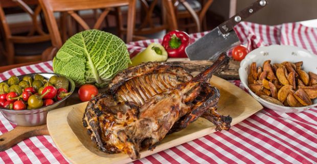3-kilové jahňa alebo kozľa pečené na drevenom uhlí s kváskovým chlebom a vínom v Ružinove.