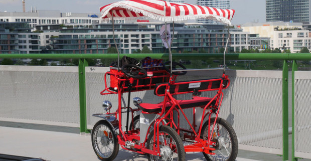 Parádny výlet po Bratislave. Hodinový prenájom 4-miestneho bicykla pre 2 dospelých + 2 deti do 8 rokov.