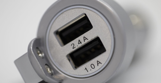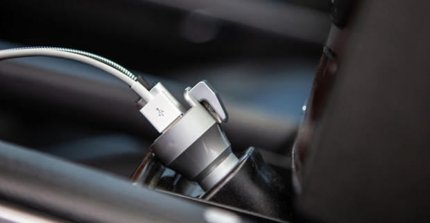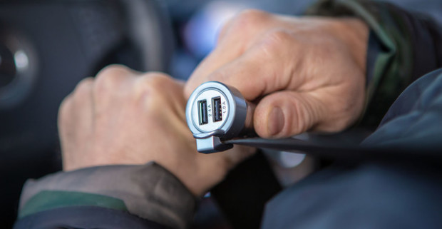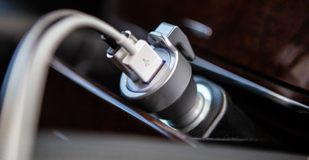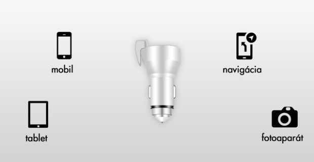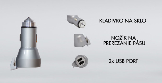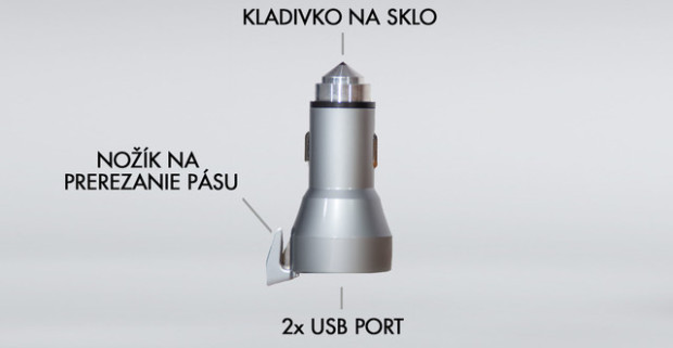Dual USB autonabíjačka s bezpečnostnými prvkami pre únik z vozidla v prípade nehody.