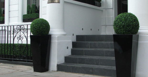 Vkusná a elegantná dekorácia - vždy zelený umelý guľatý buxus alebo kvetináč.