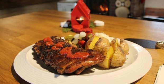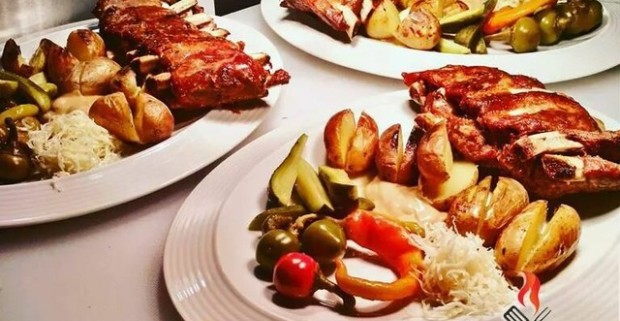500 g BBQ grilované rebierka + 150 g pečené zemiaky alebo 3 krajce chleba + 150 g kyslá obloh.