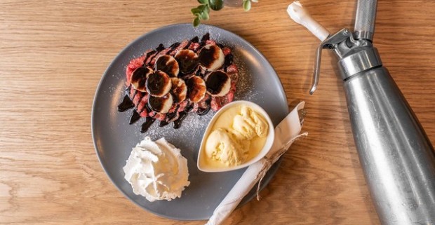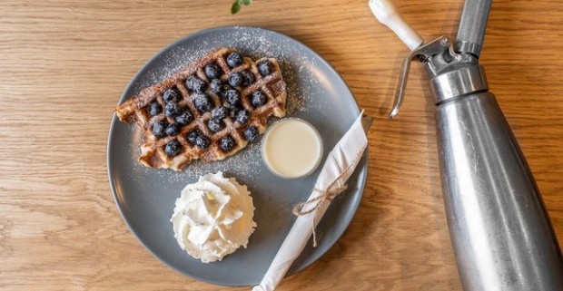 Chrumkavé waffle s čerstvým ovocím a šľahačkou - typický belgický dezert.