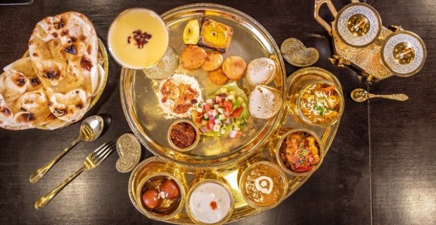 Thali menu pre 2 osoby v indickej reštaurácií The Curry - 12 rôznych druhov jedla na zlatom podnose.