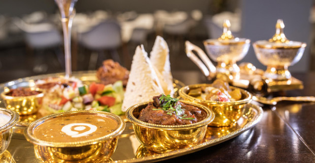 Thali menu pre 2 osoby v indickej reštaurácií The Curry - 12 rôznych druhov jedla na zlatom podnose.