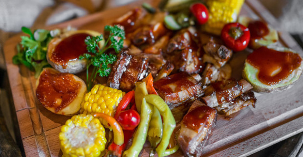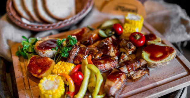 Pomaly pečené rebrá v BBQ marináde s nakladanou zeleninou alebo veľký tanier grilovaných špecialít.