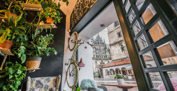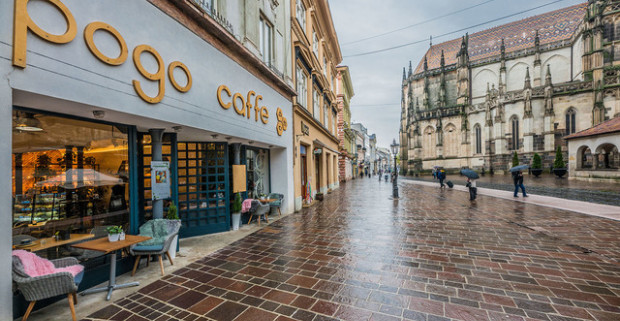 Pravé anglické raňajky s teplým nápojom v centre mesta s výhľadom na Dóm sv. Alžbety.