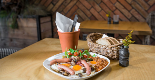 Pravé anglické raňajky s teplým nápojom v centre mesta s…