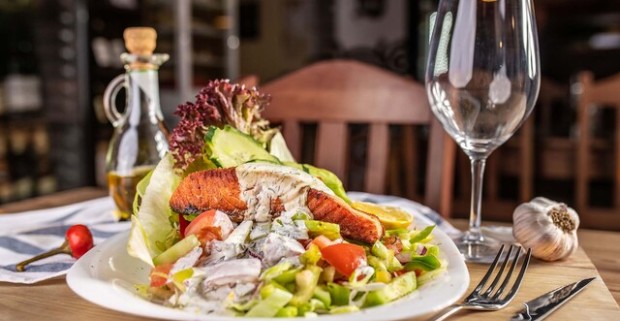 Steak z lososa v Pizza & grill Búdková - 150 g losos morský na ľahkom šaláte s kôprovým dresingom.