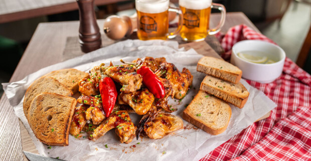 Kuracie krídelká "sweet chilli" s dvoma malými pivami v Reštaurácii…