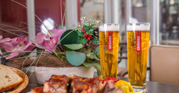 Chrumkavé grilované rebrá a dve malé pivá v útulnej reštaurácii Zlatej Lipe.